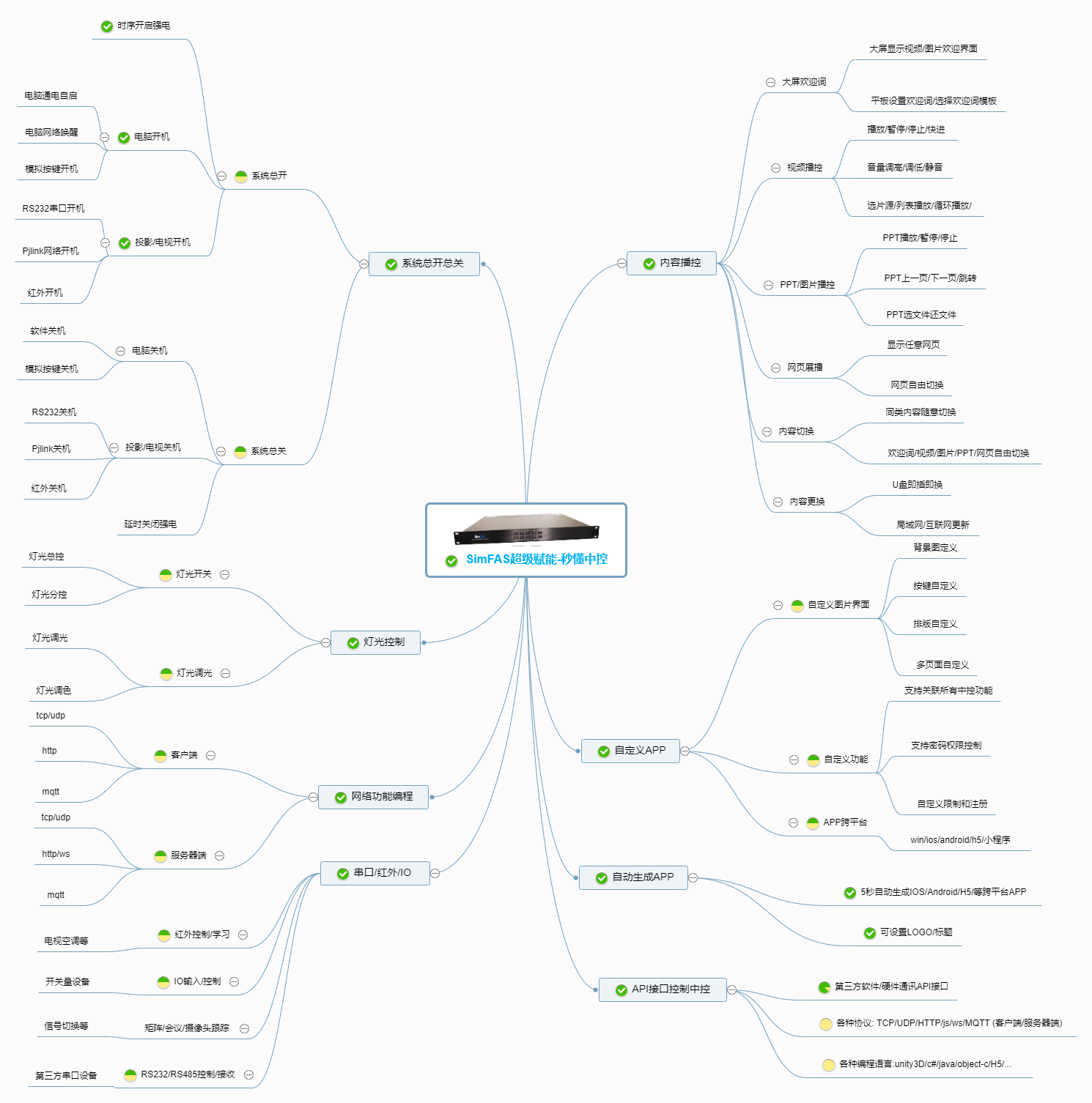 通过ipad控制对电脑上的视频/PPT/图片/网址等进行播放/暂停/音量/选片/欢迎词设置/关机等操作. |