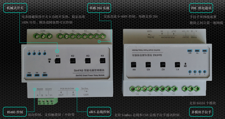 单网线供电通讯,实现POE供电 + 通讯控制, SBUS总线 + RS485 + CAN总线,支持1-65535个设备手拉手式ID联网扩展.
